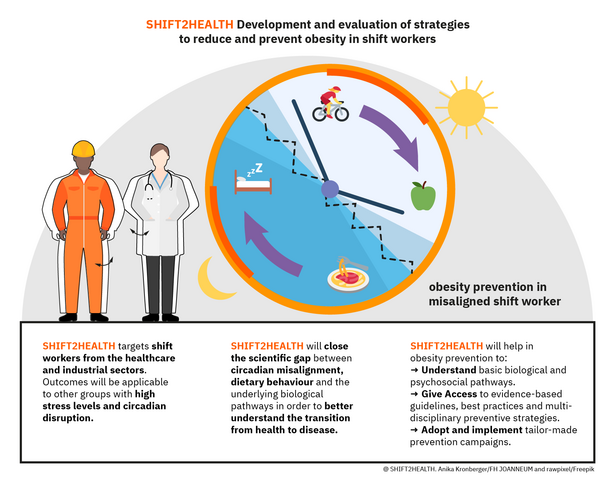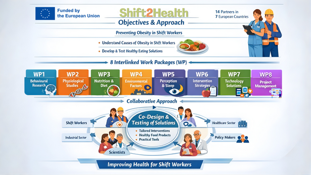 SHIFT2HEALTH funded under the EU HEALTH call “HORIZON-HLTH-2022-STAYHLTH-01-05: Prevention of Obesity Through the Life Course” is a collaborative effort of 14 European Partners in 7 European countries to gain new insights into behavioural and physiological underpinnings that make shift workers overweight and obese.