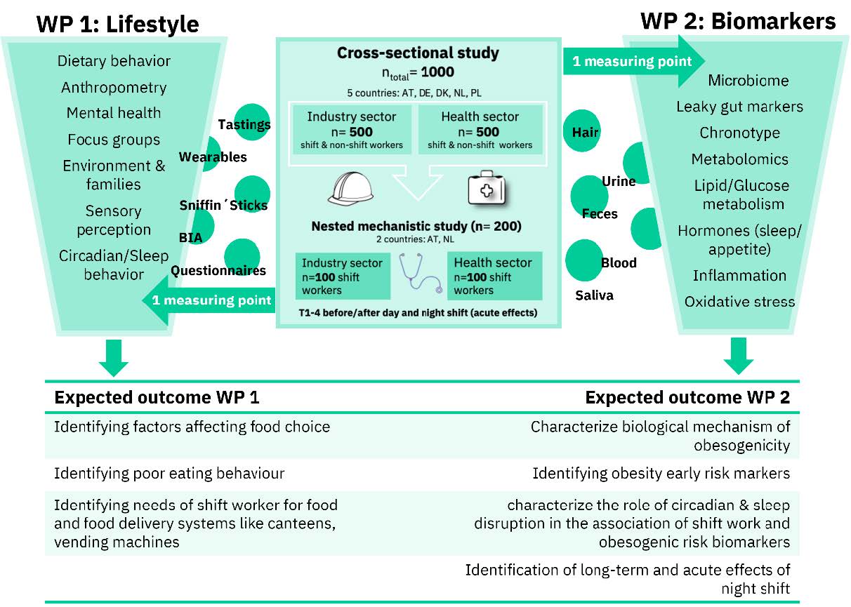 WP2 is closely linked to WP1 through a cross-sectional study (registered on ClinicalTrials.gov) across Austria, Denmark, Germany, the Netherlands, and Poland. Approximately 900 rotating night shift workers and day workers from the healthcare sector and various other industries were recruited between May 2024 and December 2026.